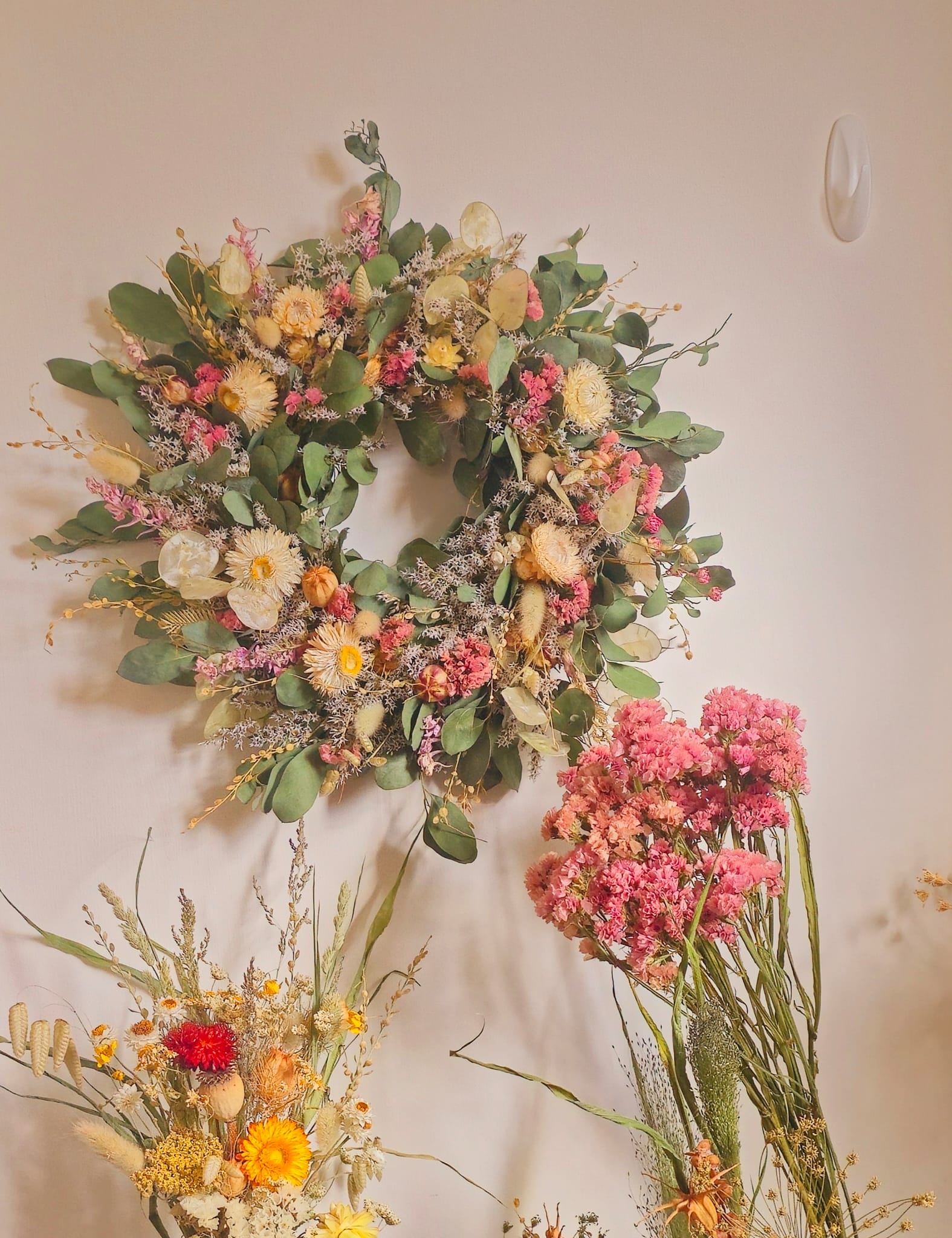 A full wreath with gorgeous eucalyptus with a touch of apricot statice. Ready to buy now!